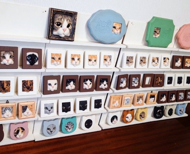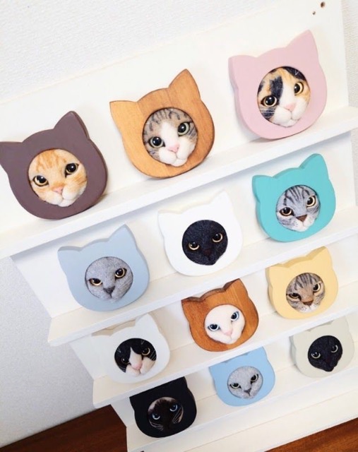 羊毛フェルトで作った猫フレーム作品とそのグッズ
