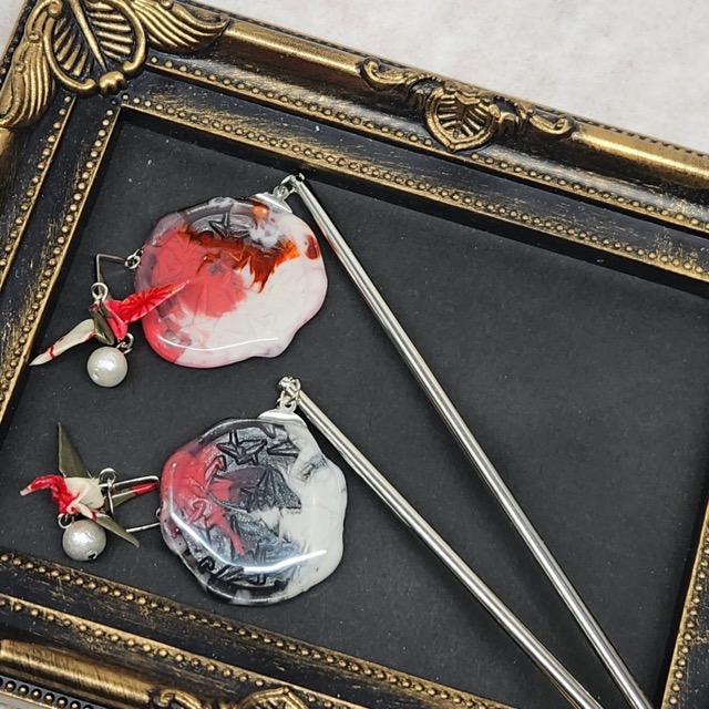 - 【身に着けられるシーリングスタンプ】ちゅるんとした滑らかな手触りとトロリとしたマーブルカラーが美しいシーリングスタンプのアクセサリーはいかがですか?他ではあまり見ないシーリングスタンプの簪(かんざし)や帯留め、ピアス等のアクセサリーは文具好き・和洋折衷コーデ好き・人と被らない物が好きという方にピッタリ!レジンで守ることによって蝋の溶けや破損、擦れによる色移りも気にせず使えます。