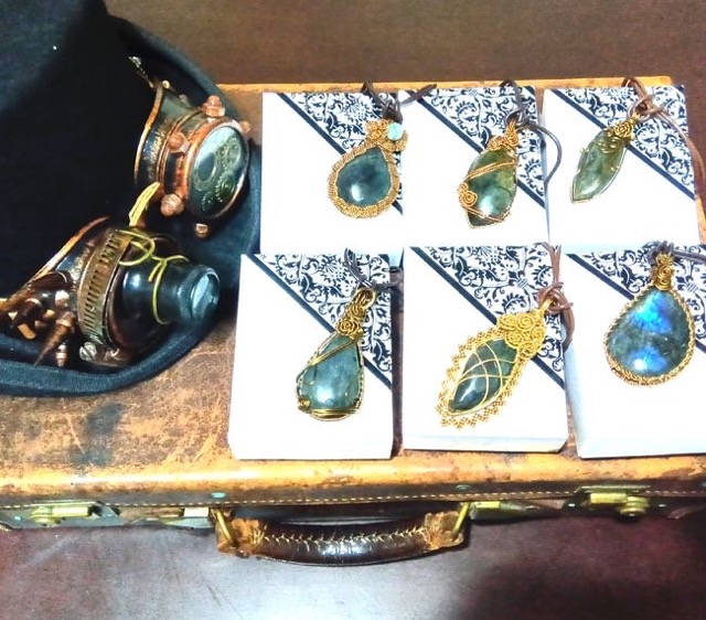 - 天然石をジュエリー専用のワイヤーで包み込んで、素敵な個性豊かなネックレスやブローチイヤリングに仕上げました。スチームパンクの装備品のゴーグルも久しぶりに持っていきます。手織りカバン、手織りコースターの雑貨も販売します。きっとお気に入りが見つかるはず。