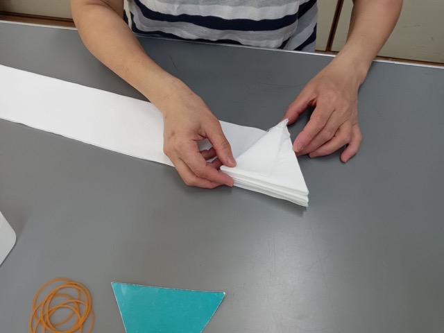 - 日本伝統工芸有松・鳴海絞の中でも、雪花絞りの体験をしていただけます。知多木綿の手ぬぐい布を三角形に折りたたんで、そのまま好きなところを染料につけます。雪の結晶の様な美しい模様に染め上げることができます。小さなお子さんから大人の方まで、初めての方でも経験者の方でも楽しんでいただける体験です。