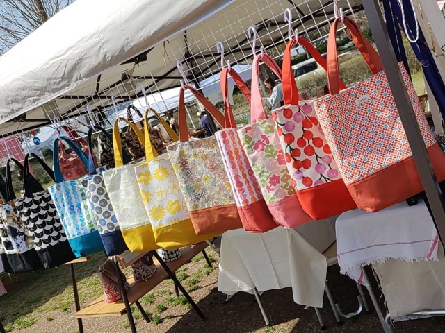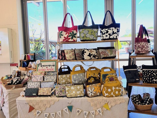 - 北欧風、花柄、動物柄などの生地で作った、バッグ、ポーチなどをたくさんお持ちいたします。ポケットをたくさん付けたりと、普段使いの使いやすさにこだわった作品ばかりです。持ってお出掛けするのが楽しみになるような、お気に入りの作品を見付けに来てくださいね。
