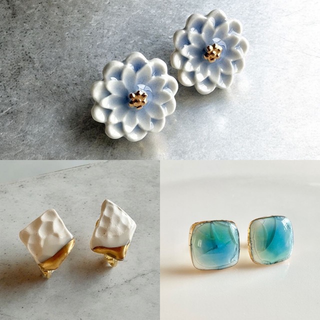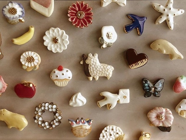 - 陶器でつくったブローチ・帯留め・イヤリング(&ピアス)の制作と販売をしています。陶器という制作方法は、短くても2か月弱の日数と多くの手間がかかるものです。しかしその甲斐あって、土の素朴な手触りや金彩の輝き、ガラス質の透明感など様々な質感と表情ゆたかな温かみある仕上がりになっています。アンティークのお皿が今も飾られるように、永く使えるアクセサリーです。手仕事を見て頂けるだけでもとても嬉しいです。