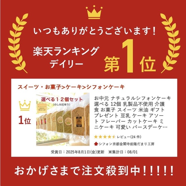 - お口に入れた瞬間、思わず 「 わ~ 」 と声が出る商品を目指して開発しています。 添加物を使用しない事、添加物を使用していない食材を使用する事、自然の味を活かす事を大切にしています。 美味しくて、安心して、安全に、いつまでも食べていただける、ナチュラルシフォンケーキ専門店を目指しています。