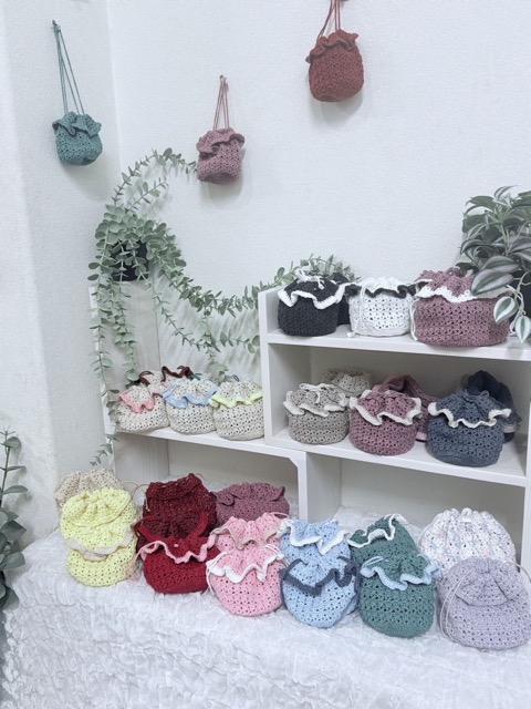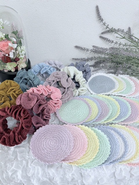 - どの色にしよう!と色を選ぶ楽しみと、毎日お気に入りの物を持つ楽しみの2つのお手伝いができたらいいなと思い、かぎ針編みでたくさんの小物を編んでいます。毎日、カバンの中に入れて持ち歩けるフリル巾着をメインに作っていて、他にもフリルシュシュ、カラフルコースター、お散歩ミニバッグなどがあります。見てほっこりする作品がテーマなので、癒されにきてください。