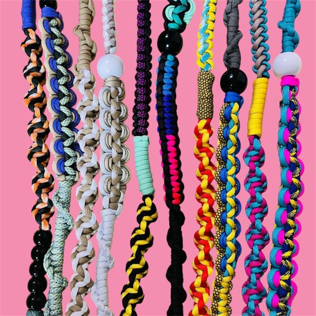 - パラコードを使ったストラップやチャームを、一つひとつ丁寧に手編みで仕上げています。色の組み合わせにこだわり、カラフルで遊び心のあるデザインに。日々のコーディネートに彩りを添え、お客様らしさを引き立てるアクセントになれば嬉しいです。