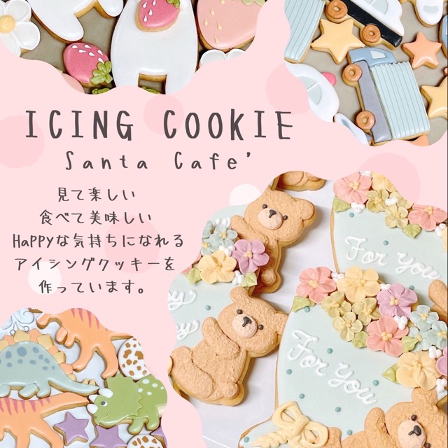 - 名古屋の中川区にオープンして17年目になります、Santa Cafe'(サンタカフェ)と申します。 クリエーターズマーケットでは、プレゼントにもぴったりな繊細で可愛いアイシングクッキーをメインに、シフォンケーキのラスクや各種クッキーを販売いたします。