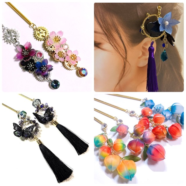 - 主にプラバンやレジンで製作した、季節の花や蝶を使用した簪・イヤーカフをメインで取り扱っており、他にブローチやヘアクリップもご用意しております。