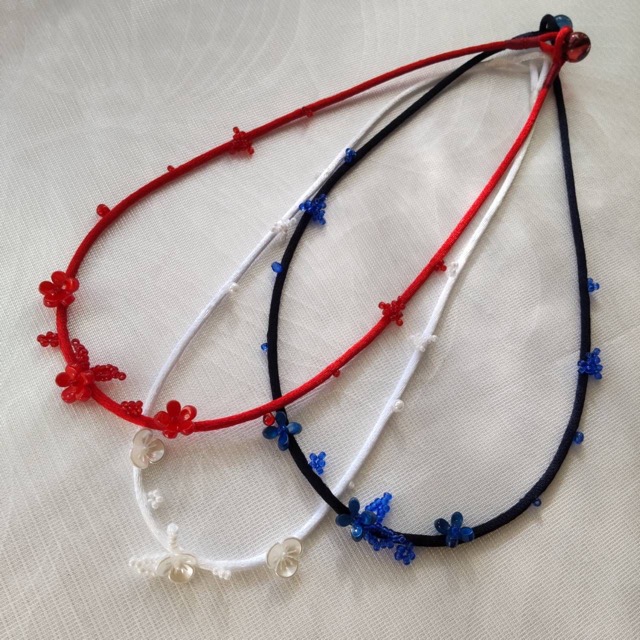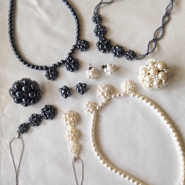 - まだあまり知られていないソォゥオンコードアクセサリー(sew on cord accessary)。光沢が美しいしなやかなコードにビーズやパーツを一つ一つ丁寧に縫い付けて作る今までにない新しいアクセサリーです。軽くて着け心地が良く肌にも優しいのが魅力の一つです。そしてもう一つはパールビーズの花編みモチーフで作るアクセサリー。コットンパールと樹脂パールを使っているので、軽い仕上がりになっています。