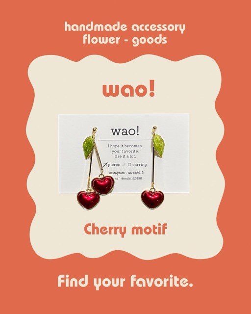 - wao!と言う名前は【 私のお気に入り! 】から"わ"と"お"を取って名付けました 誰でも服やアクセサリー、雑貨など自分だけの【私のお気に入りのモノ】ってありますよね。wao!のショップで気にいるもモノを見つけて、あなたにとっての【私のお気に入り】に入れてもらえたら嬉しいです*** 最近はフラワーアイテムやアクセサリー雑貨なども制作しております!ぜひ手に取って見てみて下さい