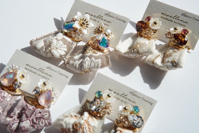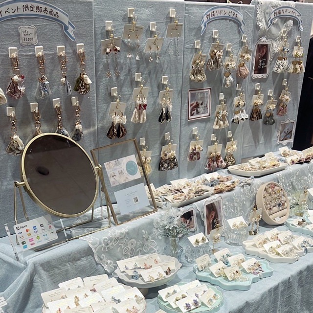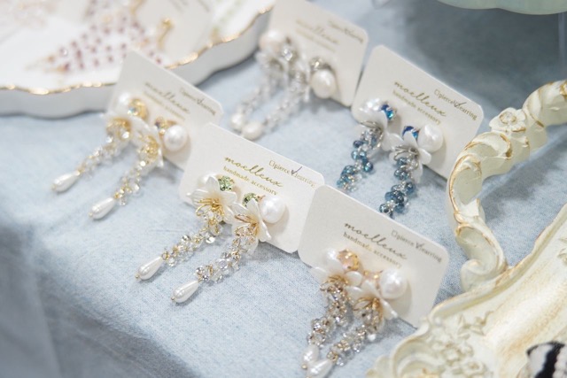 - フラワーモチーフや刺繍リボンの使用をメインとし、ピアスキャッチの変更やイヤリングは金具変更で2つのデザインで楽しめるイヤーアクセサリーをメインにご用意しております。 対面イベント限定で、お好きな組み合わせでの販売も行っておりますので世界に一つだけのオリジナルイヤーアクセサリーもお作りいただけます。 その他にもネックレスやブレスレット、リングなどもご用意させていただく予定です。