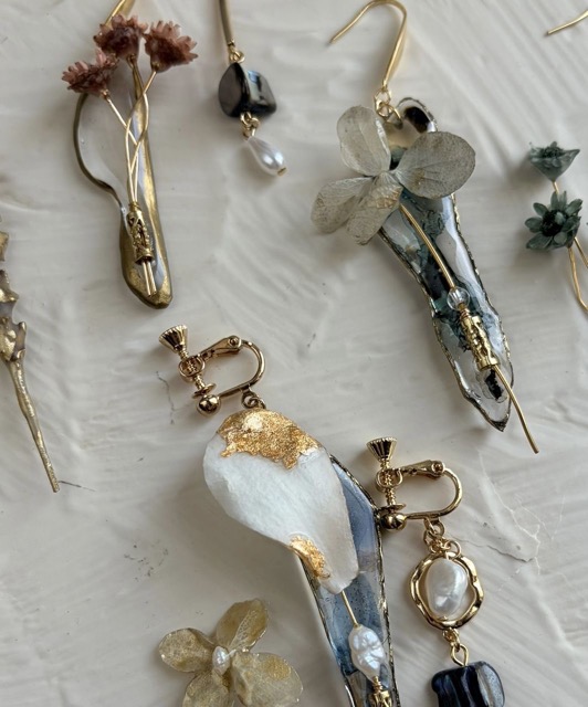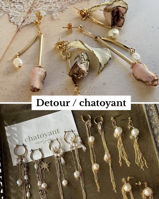 - chatoyant ゴールド×リアルパール「毎日が特別な日になるアクセサリー」をコンセプトに、身につけるだけでご機嫌な1日を過ごせるようなアクセサリーを、ひとつひとつ丁寧にお作りしています。 Detour アシンメトリーで魅せる、自分だけの花本物のお花とアシンメトリーのアクセサリーを販売しております。レジンに埋め込まない珍しいデザインです。フリーハンドで作るレジンの違いをお楽しみ下さい。
