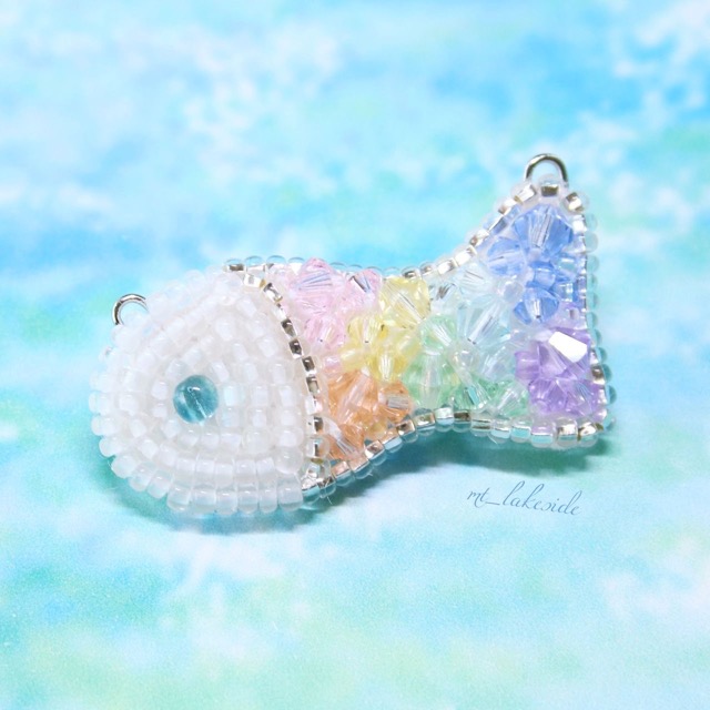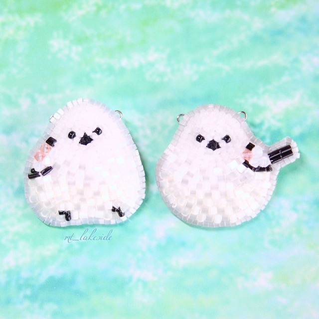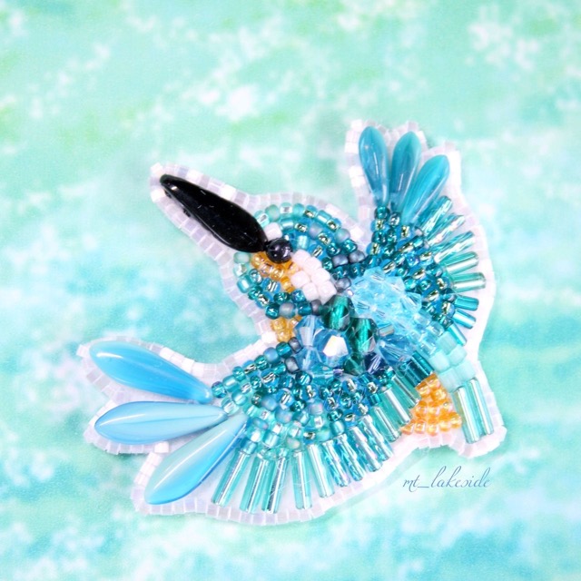 - 鳥やちょうちょ、おさかなや虫などの「みずうみのほとりに集う生き物たち」のビーズ刺繍作品をひと針ひと針じっくり手縫いで心を込めて制作しています。クリスタルガラスビーズや年代物ビーズなど色味と輝きにこだわったビーズを組み合わせ、まるで絵を描くように繊細に生き物のきらめきを表現しています。