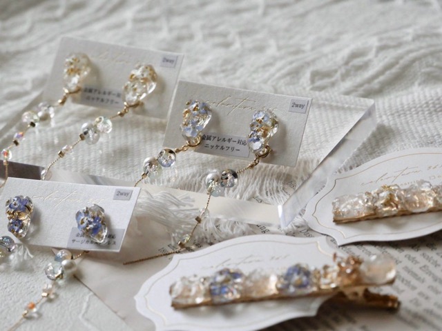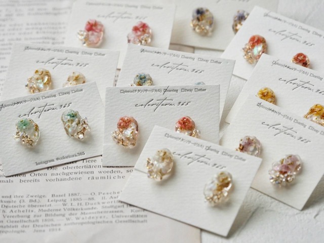 - 「何気ない日常に彩りを」をコンセプトに 手作りの型にお花を閉じ込めた「花鉱石アクセサリー」をメインに制作しています。 また、水性樹脂を使ったトレイや季節雑貨もご用意しています。 アクセサリー同様、模様や色味はどれも世界にひとつだけ。 ぜひ日常を彩るお気に入りを見つけにきてください