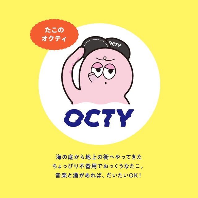 - オリジナルキャラクターのピンク色のたこのOCTY(オクティ)。 海の底から地上の街へやってきた ちょっぴり不器用でおっくうなたこ。 音楽と酒があれば、だいたいOK! OCTYくんステッカーやトートバッグ、ロンT、立体作品などを販売します。