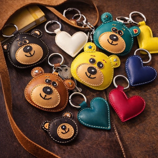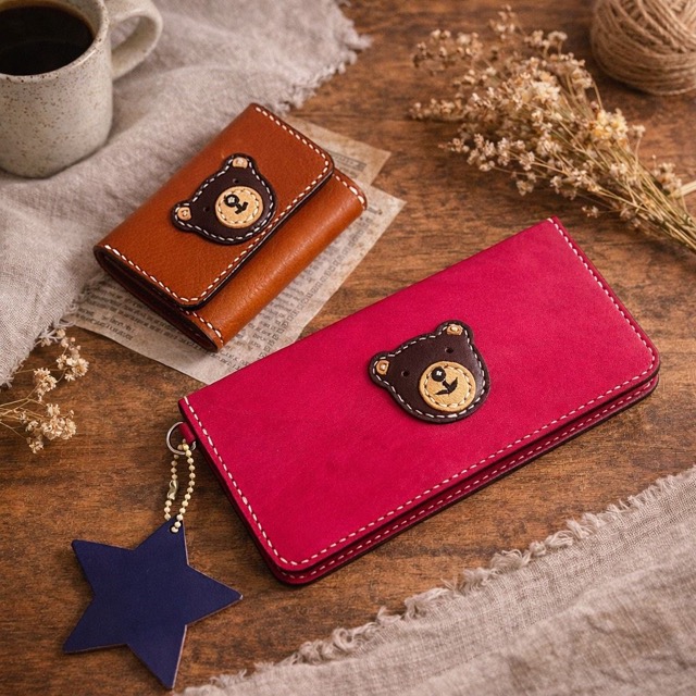 - オリジナルデザインのクマをモチーフにした革小物シリーズ。財布やキーリングはすべて手縫い・手染めで仕立てた一点ものです。似ているようで少しずつ違う表情や色合いはハンドメイドならではの魅力。お気に入りのクマを、ぜひ探しにきてください。 ・ヘアアクセサリーもご用意しています。