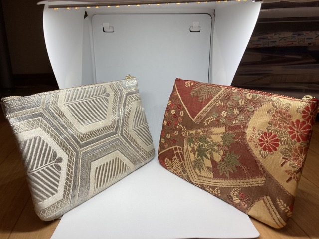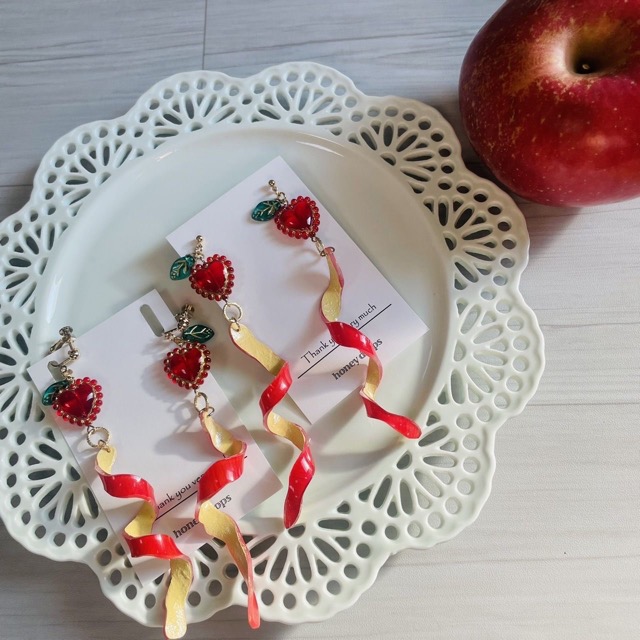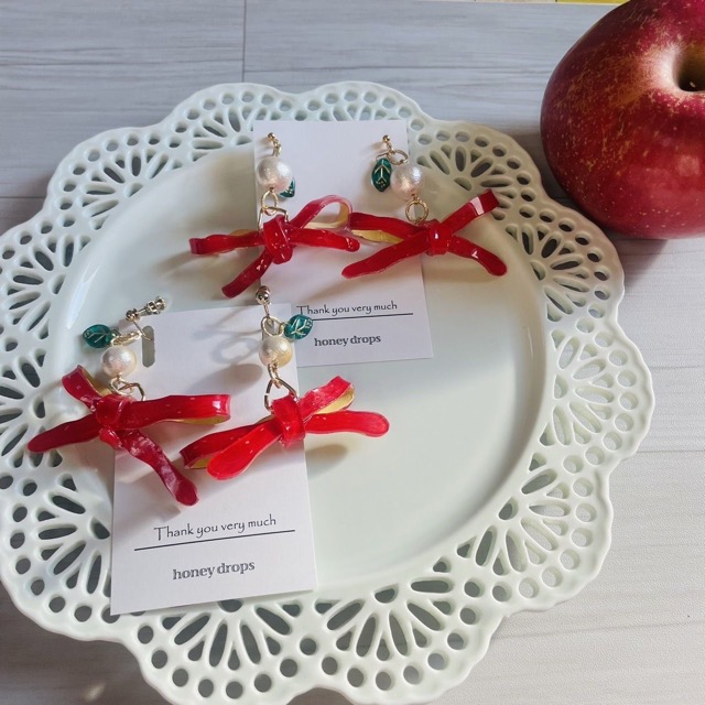 - 果物をモチーフにしたイヤーアクセサリーがメインです。花モチーフのもあります。プラ板で作っています。他にも日常使いに強いポーチや布バック、着物の帯で作った和風バックもおすすめです。