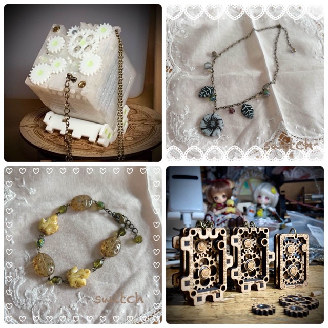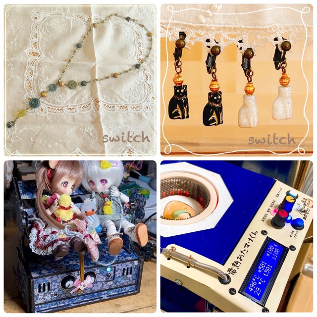 - switchは、るりいろとここたねの合同サークルになります。るりいろは主にチェコのガラスビーズを使った一点ものアクセサリーとドール用雑貨、ここたねは3Dプリンタ、レーザー加工機、ガラス細工、プログラミング等々を駆使した作品を作っています。ネックレスの歯車が回るオルゴールとか、お人形が動くオートマタな素敵な作品たちが展示も楽しくお待ちしております!