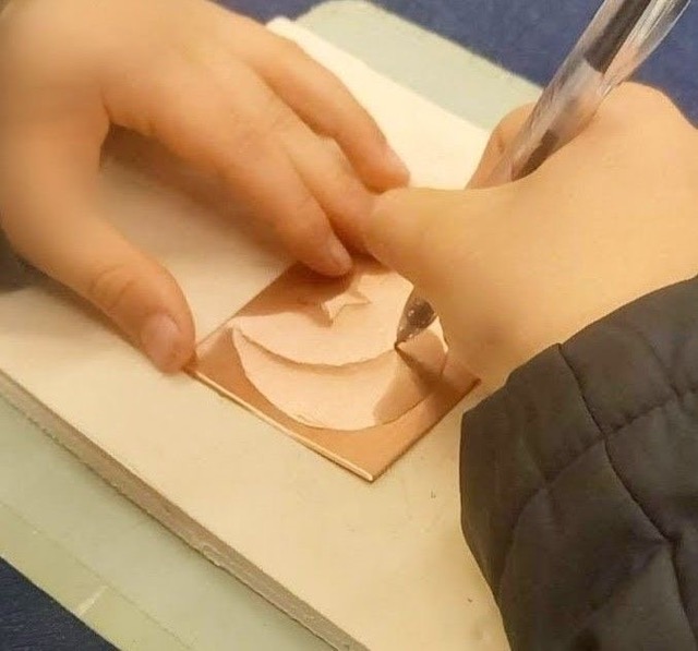 - 『ヘラ出し』という技法を用いて、薄い銅板に立体的な模様を浮かび上がらせるワークショップです。 鉛筆で文字を書く程度の筆圧で制作できるため、小1のお子さんから大人まで幅広く楽しんでいただいています。パンダやハート・季節のイラストなど下絵をご用意しておりますので、事前準備は必要ありません。手ぶらで気軽に参加いただけます。