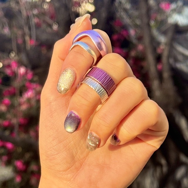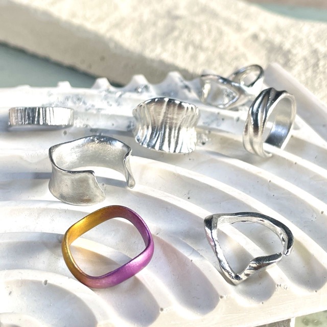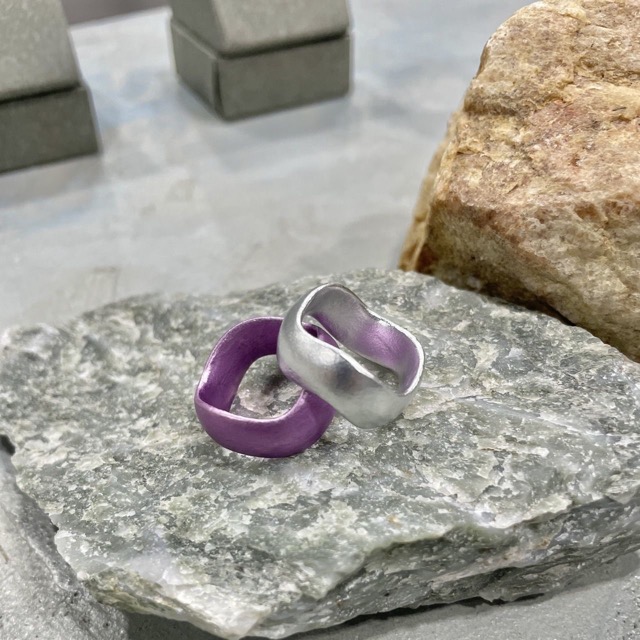 - 純アルミニウムに惹かれて 原型から鋳造まですべて手作りしています。 シルバー、プラチナとは一味ちがった 絹のような澄んだ光沢が魅力です。 アルミニウムは地金を染められる珍しい金属で、カラーリング、グラデーションもご用意しています。 金属アレルギー対応素材です。