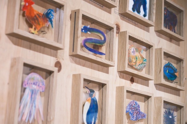 - 重機やいきものをテーマにした作品を制作。クレヨンで彩色した画用紙をパーツごとに切り、重ね合わすというオリジナルの技法を用いる。カラフルで生き生きとした表現が特徴。2025年には古材フレーム制作「TJ frame」を立ち上げる。一級建築大工技能士と共に、解体された家屋や家具の古材を使った額縁を制作する。