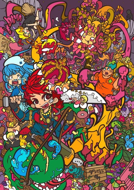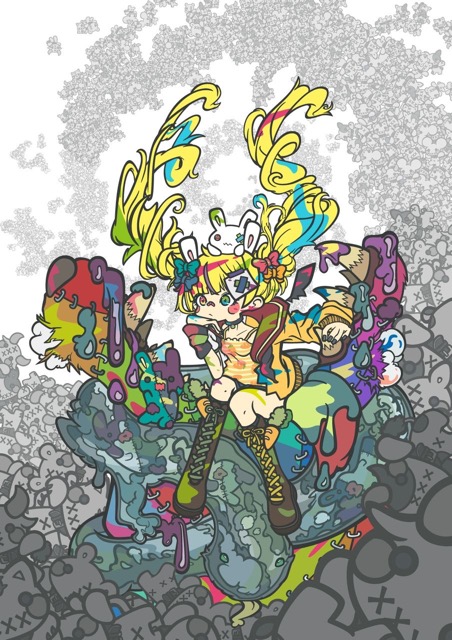1つの作品に、物語を詰め込んで描いています ごちゃごちゃでパキっとした作品をお楽しみください。 キャンバスプリントされた作品や、ステッカー、ポストカードなどの販売をします。