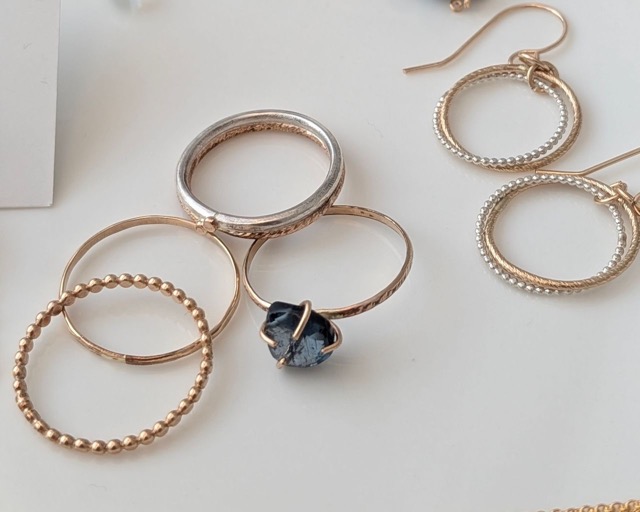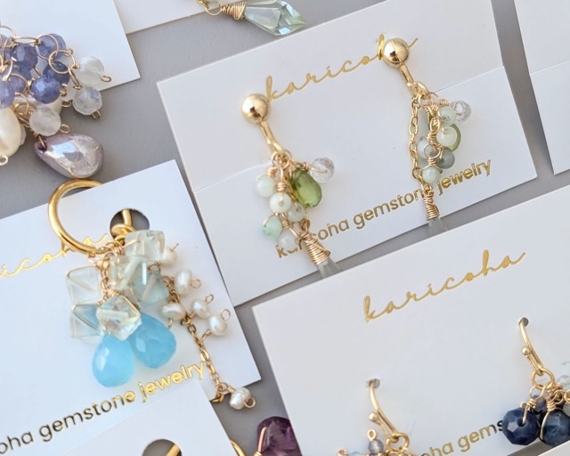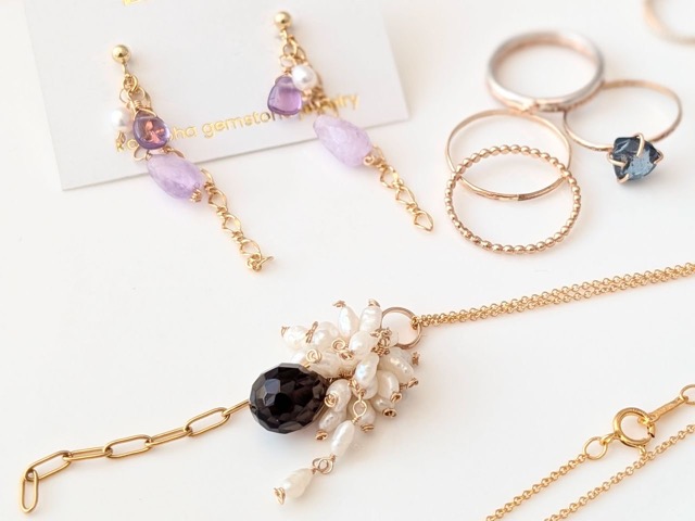 - 天然石と淡水パールを使った輝く華やかな耳飾りやネックレス、ブレスレットを制作販売しています。 また、一つ一つ丁寧に作り上げる14kgfやSV925素材のシンプルな地金を活かした一点物の彫金ジュエリーを販売しています。 当日はサイズオーダーも受付予定です。