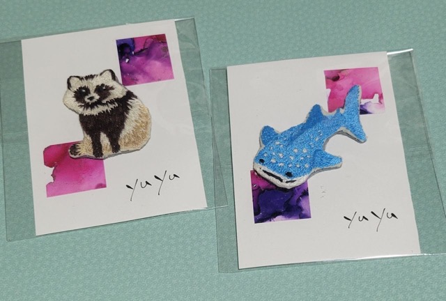 - がま口の文庫本ケースを作っています。(ブックカバーみたいなものです) 本の持ち歩きをよくする方におすすめしたいです! 来店ついでにおすすめの本の紹介していって下さると泣いて喜びます! リアル寄りの絵柄の刺繍ブローチも販売しております。
